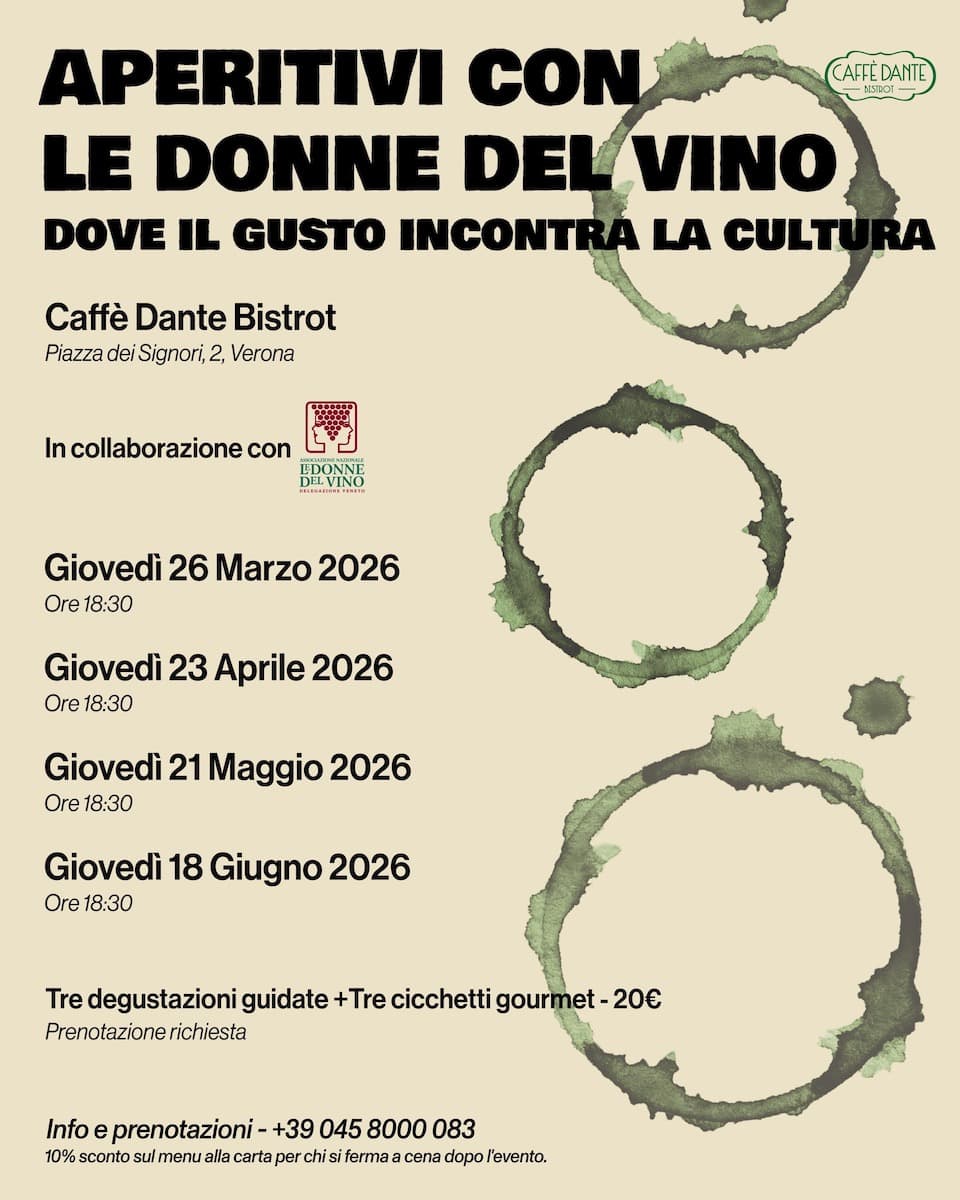 Aperitivi a Verona delle Donne del Vino. Verona si prepara a unire gusto e cultura con una nuova rassegna di aperitivi dedicata alle eccellenze enologiche femminili. Al Caffè Dante Bistrot, in Piazza dei Signori 2, debutta “Aperitivi con le Donne del Vino. Dove il Gusto incontra la Cultura”, un ciclo di quattro serate pensate per chi ama il vino ma anche le storie che lo accompagnano. L’iniziativa è realizzata in collaborazione con l’Associazione Nazionale Le Donne del Vino – Delegazione Veneto.
