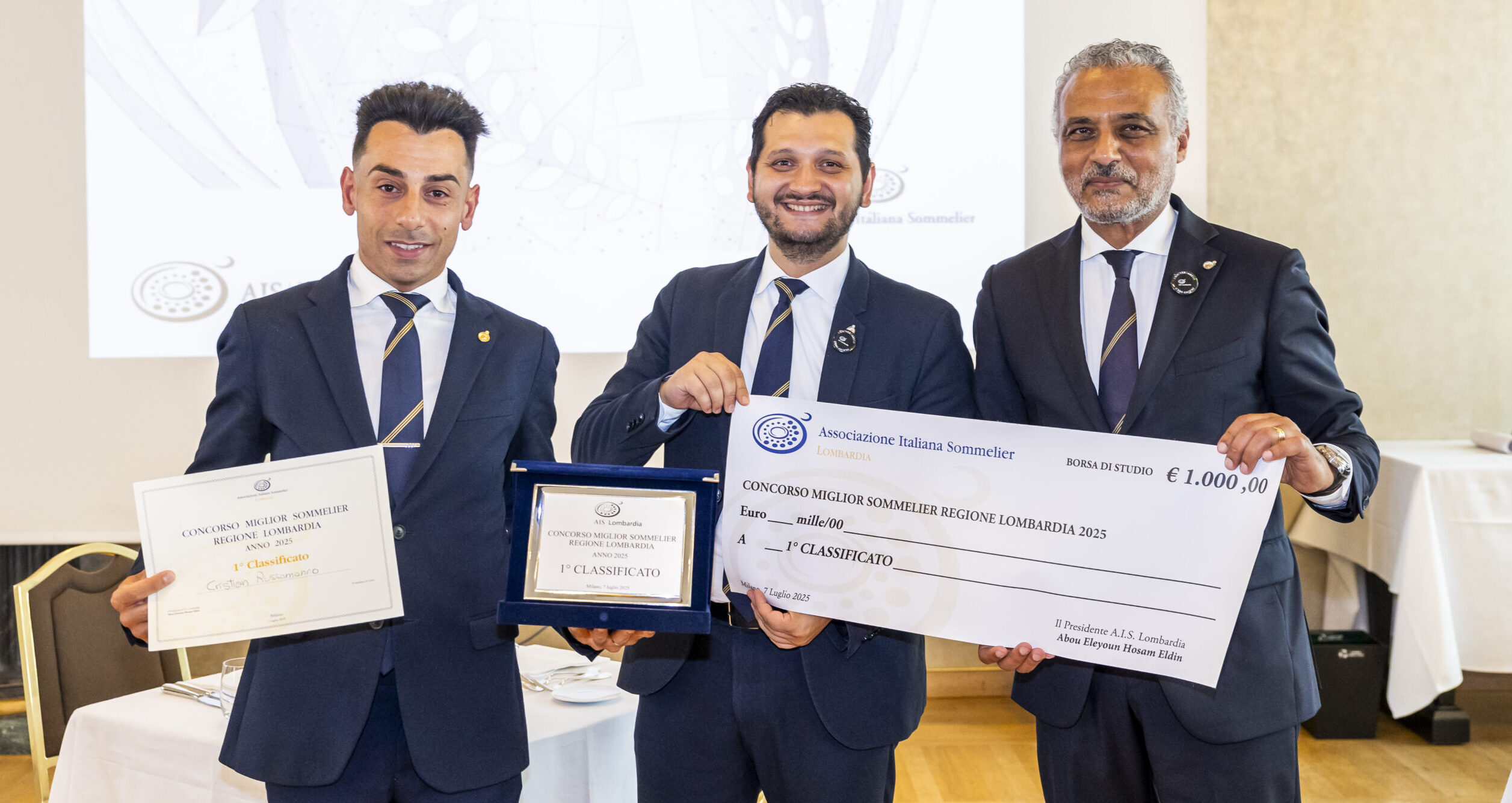 A seguire Russomanno sul podio, i sommelier della delegazione AIS Monza e Brianza: Andrea Russetti (secondo) e Flaminia Fossati (terza). Alle selezioni mattutine hanno partecipato 11 professionisti da varie province lombarde. Il presidente di AIS Lombardia, Hosam Eldin Abou Eleyoun, ha sottolineato: “Il concorso lombardo quest’anno ha aperto i festeggiamenti per i 60 anni della nostra Associazione, che dureranno per ben cinque giorni.Questa storica competizione, nata nel 1992, anche questa volta ha messo in evidenza sommelier davvero molto preparati…”.