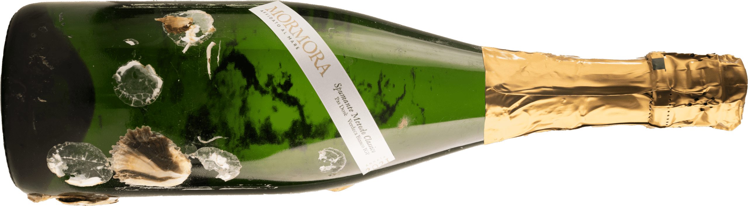 Mormora Metodo Classico Pas Dosé – 11% vol. – Viene ottenuto da uve Verdeca, con una percentuale limitata di Maresco, della vendemmia 2021. Dopo la raccolta il pigiato viene raffreddato, svinato in pressa pneumatica, poi il mosto è illimpidito mediante decantazione statica. La prima fermentazione alcolica dura 10-12 giorni, a temperatura controllata. Dopo il tiraggio, la presa di spuma, l’imbottigliamento, vengono preparate le gabbie di acciaio inox e poi immerse sui fondali marini a una profondità di 33 metri dove la temperatura è costante a 12°-15°, dove permangono per almeno dodici mesi. Dopo il ripescaggio e la sboccatura con rabbocco con lo stesso prodotto. Nel calice ha un colore giallo paglierino, con riflessi verdolini e bollicine fini e presenti. All’olfatto presenta nitide percezioni floreali a petali bianchi, poi agrumi, piccole note di frutta tropicale, con un tocco di erbe sul finale. Al palato è fresco, glicerico, poi è sapido, di ottima persistenza con un retrogusto che spazia dagli agrumi alle erbe.