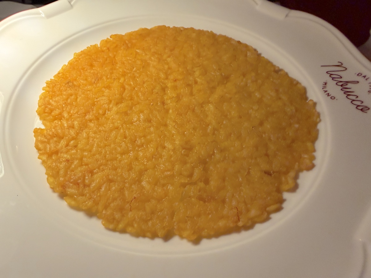 Un altro piatto dal gusto pieno è il Ragoût di vitello, ossia maccheroncini verdi al ragoût bianco con funghi e tartufo nero: qui i profumi di sottobosco dei funghi e l’intensità del tartufo arricchiscono il piatto ampliandone lo spessore aromatico. Lo stile che accomuna questa ad altre portate è il controllo dell’intensità: anche quando il gusto aumenta di volume, non arriva mai a concentrazioni di sapori distoniche o invadenti. Gioca invece sulle consistenze il Riso al salto, specialità milanese in versione decisamente croccante: un biscotto di riso.