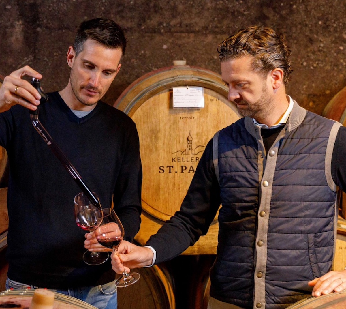 Philipp Zublasing (a sinistra) e direttore Tobias Leimgruber al lavoro nella barricaia della Cantina Sankt Pauls /foto ©ThiloWeimar.